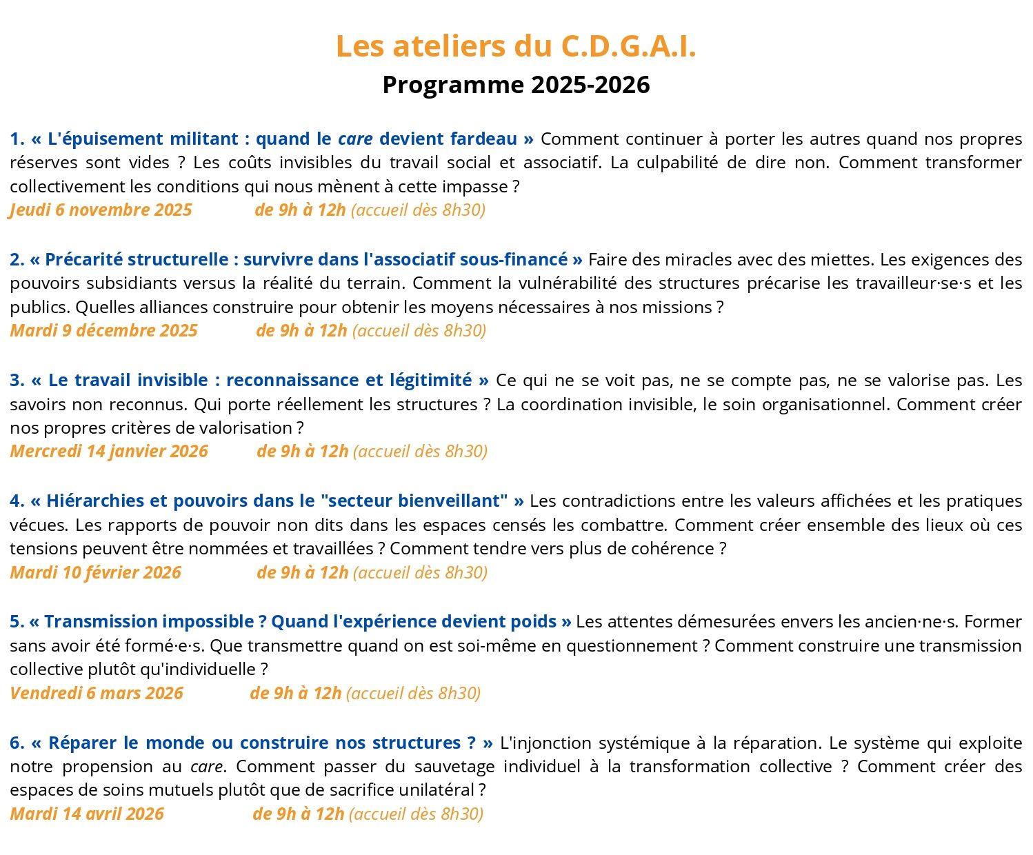 De novembre 2025 à avril 2026, le C.D.G.A.I. organise ces ateliers se voulant un espace de réflexion et de parole libre, distinct des cadres habituels.